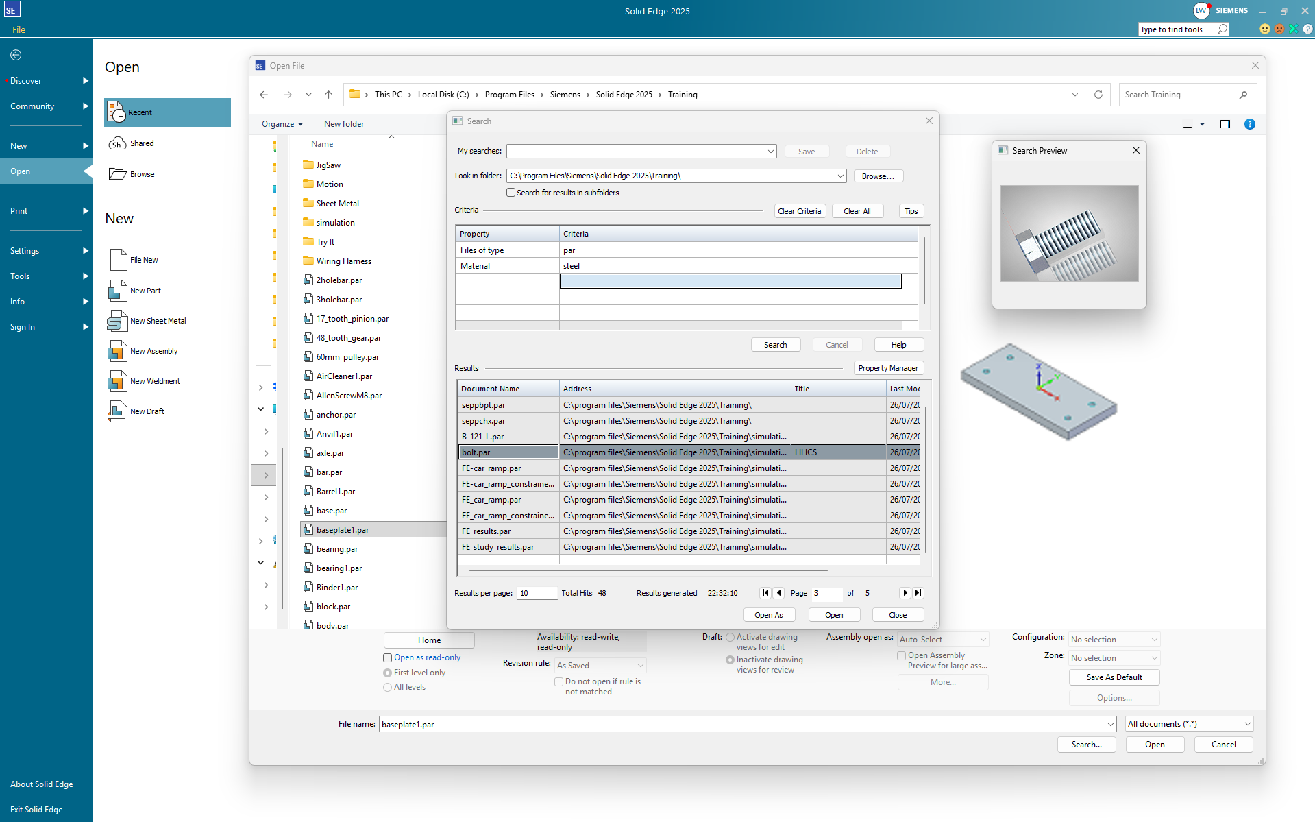 The Solid Edge search dialog is powerful, but it is still embedded in a file-open workflow. It is designed to locate documents, not to actively explore, compare, and curate a growing design library.